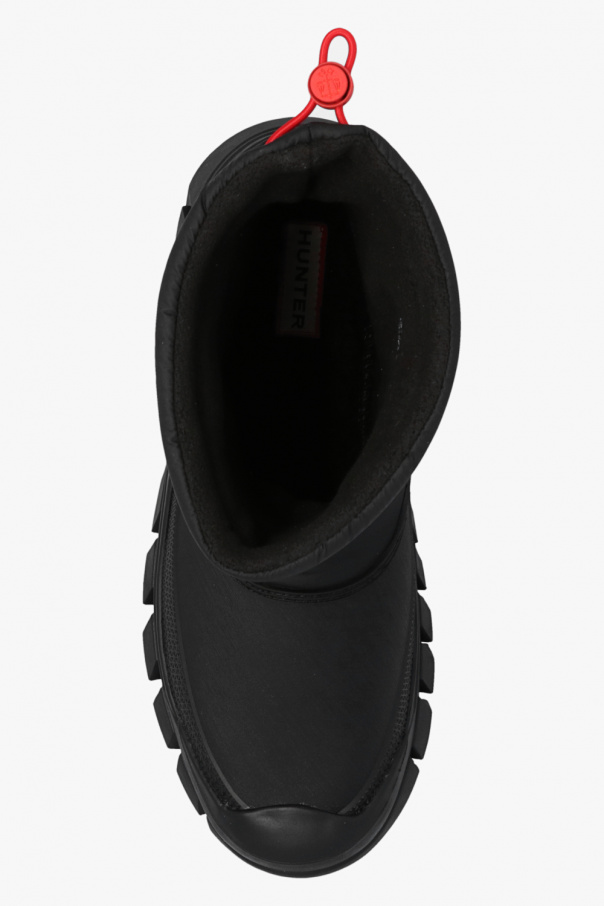 Black ‘Intrepid’ waterproof snow boots with a white, red and black logo patch and brown sole from Hunter. Handcrafted with a recycled nylon upper, recycled fleece lining and an innovative Ortholite® footbed. The topline retains warmth. Can be worn in temperatures as low as -20°C (-4°F).