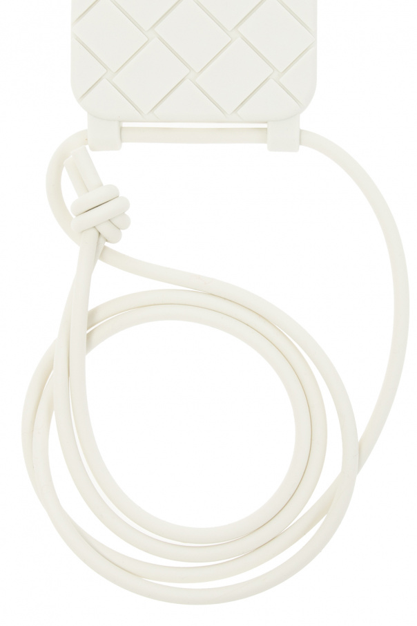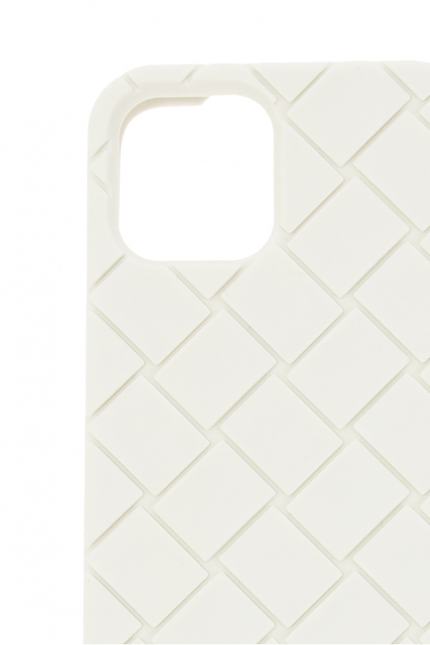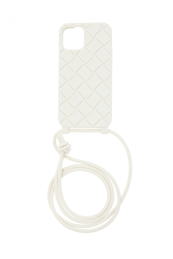 White iPhone 12 Pro case with a raised pattern and a strap from Bottega Veneta.