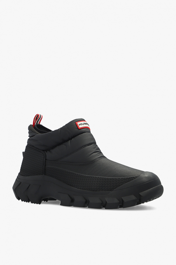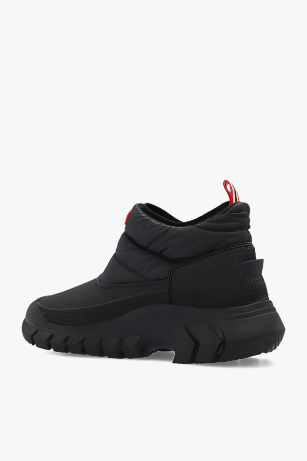 Black ‘Intrepid’ waterproof snow boots with a white, red and black logo patch from Hunter. Handcrafted with a recycled nylon upper, recycled fleece lining and an innovative Ortholite® footbed. The topline retains warmth. Can be worn in temperatures as low as -20°C (-4°F).