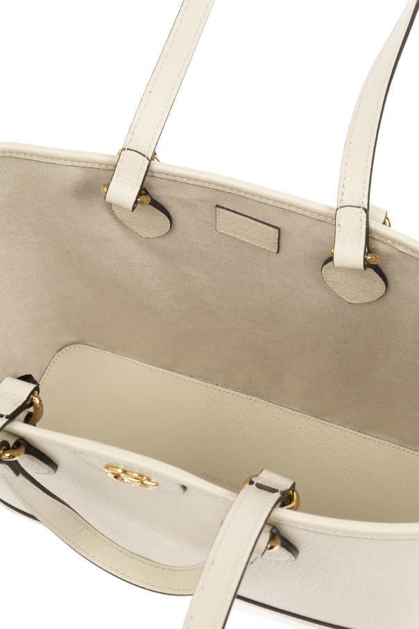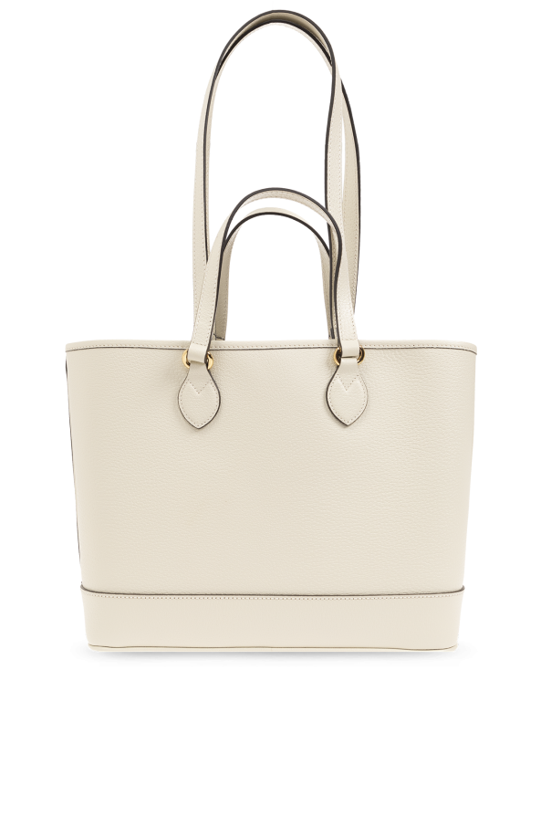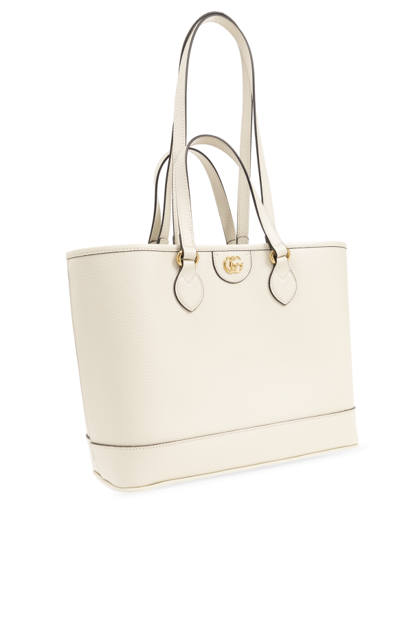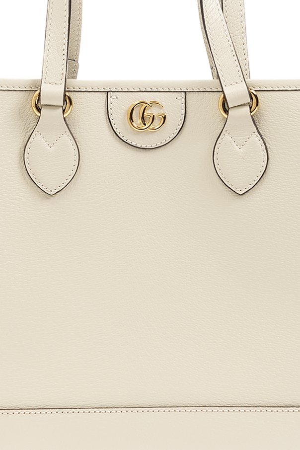 Cream ‘Ophidia Smalli’ shopper bag from Gucci. Made of calf leather, this design showcases Double G hardware on the front, four handles, gold-tone metal elements and one internal compartment.
