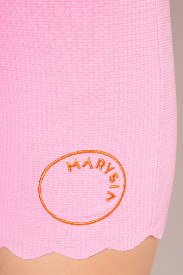 Pink ‘Billy Jean’ shorts from Marysia, the ‘SPORTCLEAN’ collection. Made of elastic, textured fabric, this pair features an elasticated waistband, orange logo embroidery on the front and the brand's signature raw edge, hand cut scallops.