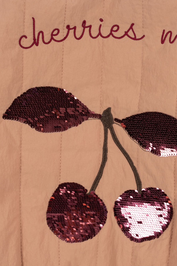 Pink bomber jacket from Konges Slojd. Fastened with a zip, this garment features a cherry pattern, two slip pockets and ribbed trims at the crew neck, hem and cuffs.