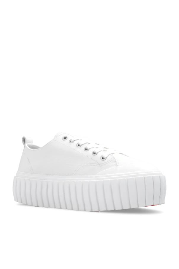 White ‘S-HANAMI’ sneakers from Diesel. Made of leather, this lace-up model sits on a red and white platform rubber sole and showcases a printed logo of the brand.