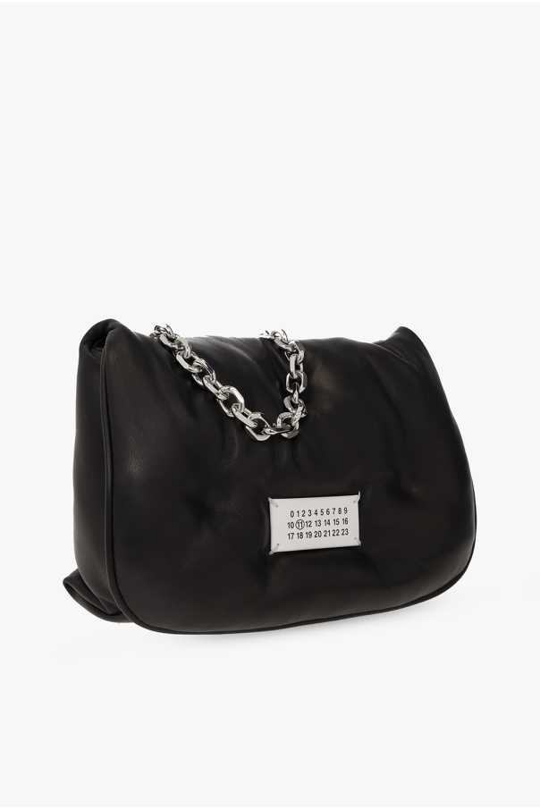 Black quilted 'Glam' shoulder bag from Maison Margiela. Made of leather, this model features a flap with a magnetic snap, white logo patch, shoulder chain, silver-tone metal hardware and one internal compartment with one slip pocket.