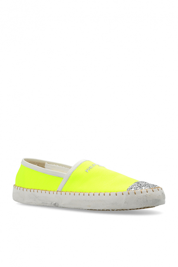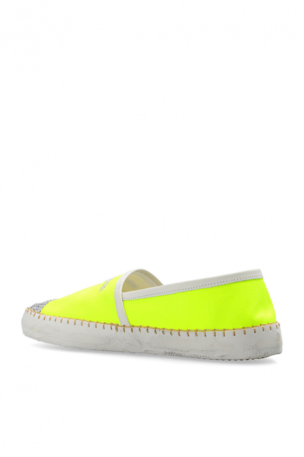 Neon yellow ‘Marseille Low’ slip-on shoes from Philippe Model. Made of canvas with leather trims, this pair features a silver-tone logo embroidery, glitter finish, decorative stitching details, vintage effect and rubber sole in beige and cream.