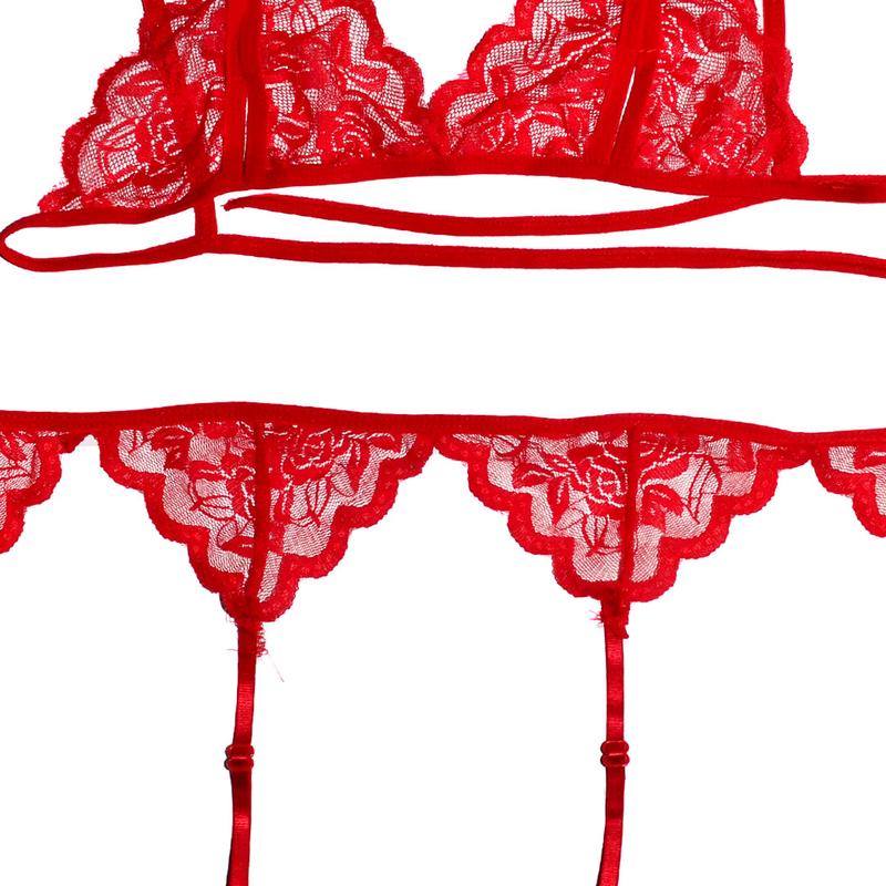 Эротический комплект (игровой костюм, костюм для ролевых игр) бюстгальтер, трусы и пояс для чулок (без чулок) из прозрачного цветочного кружева.