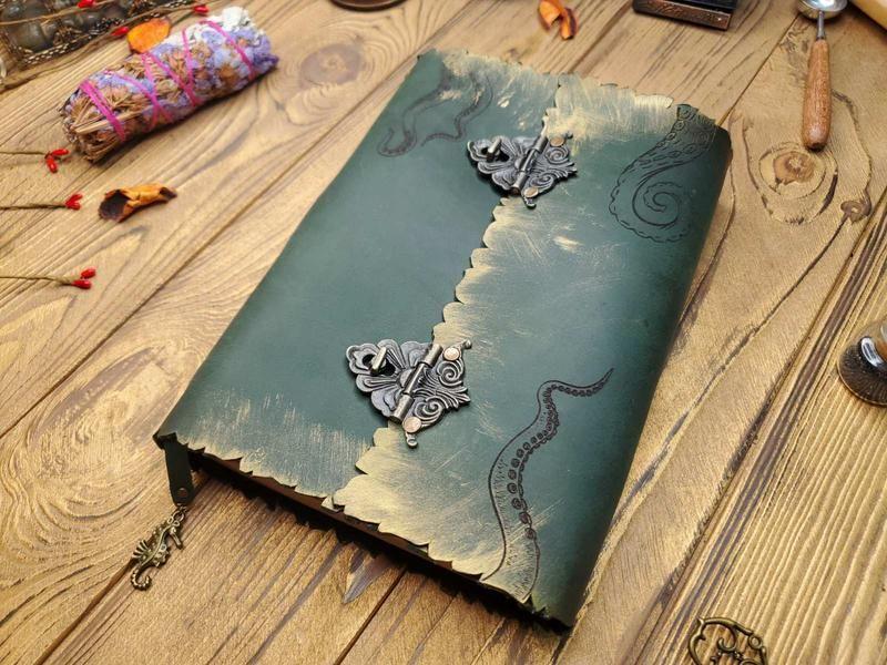 Шкіряний блокнот стане чудовим помічником, який зберігатиме Ваші думки, плани та мрії, записані в ньому.На фото приклад шкіряного тематичного софтбуку формату А5. Всередині блокнота 90 крафт аркушів та друкованими іллюстраціями. Аркуші пришиті, не змінні. По периметру обкладинки ефект рваного краю бронзове напилення. Софтбук зачиняється на 2 замочки поворотні. На обкладинці з обох боків присутнє тематичне гравіювання. Шкіряна закладинка з підвіскою в комплекті. Ціна виробу в такому дизайні – 2200 грн.