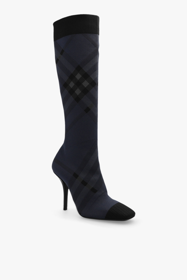 Black and grey ‘Dolman’ heeled boots from Burberry. Made of fabric, this pair features an elasticated top, the brand's signature check, square toe and black leather sole.