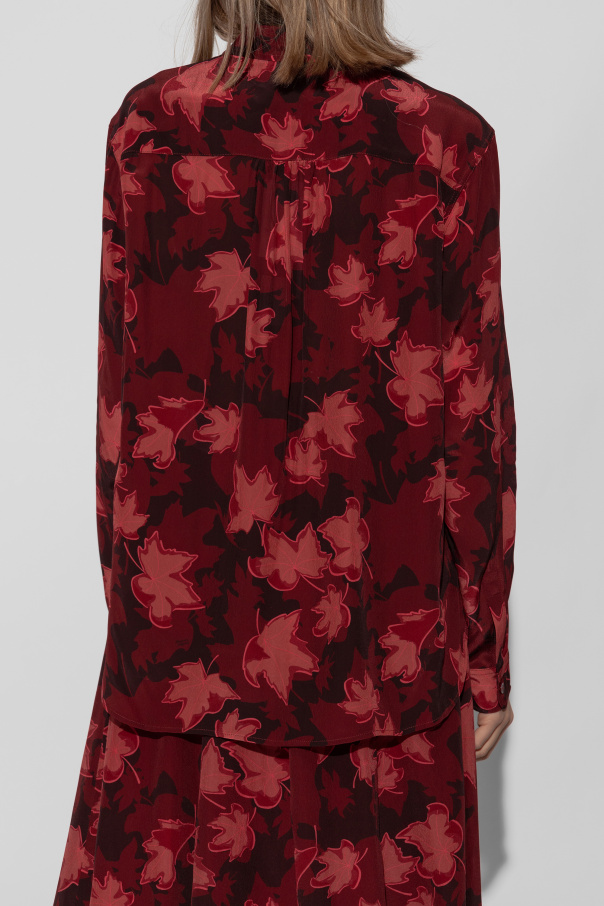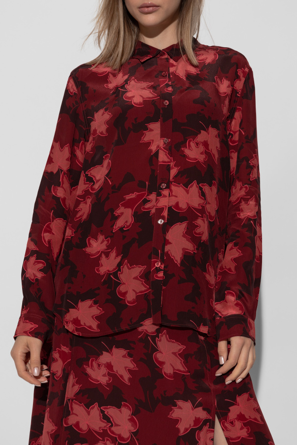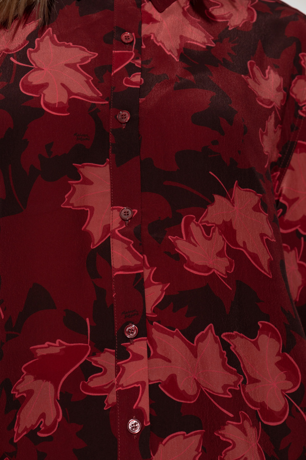 Introducing the Printed Shirt from the esteemed Maison Kitsuné, an embodiment of elegance and sophistication. This women's shirt boasts a rich burgundy hue adorned with an expressive pattern of large, abstract leaves in shades of deep red and pink. Crafted from luxurious viscose, the fabric exudes a lightweight and breathable quality, imparting an effortlessly chic appearance. Designed with a classic silhouette, this shirt features a collar and front button closure, allowing for a refined and polished look. The leaf motif is meticulously distributed across the garment, enhancing its artistic allure. As part of a coordinated ensemble, this shirt pairs beautifully with a matching skirt, as depicted in the imagery. Subtle button detailing seamlessly integrates with the overall design, ensuring the focus remains on the captivating pattern. Ideal for elegant occasions, this shirt adds a touch of sophistication and modernity to any wardrobe. Why Choose This Product? Exquisite design from renowned brand Maison Kitsuné. Luxurious viscose material for comfort and style. Distinctive leaf motif for an artistic flair. Perfect for sophisticated events and gatherings.