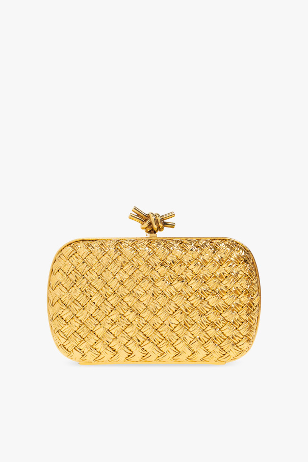 Gold-tone ‘Knot Small’ handbag from Bottega Veneta. Crafted from crinkled calf leather with the brand's signature ‘Intreccio’ weave, this design features an antiqued gold-tone brass snap fastener with a knot shape, and one internal compartment.
