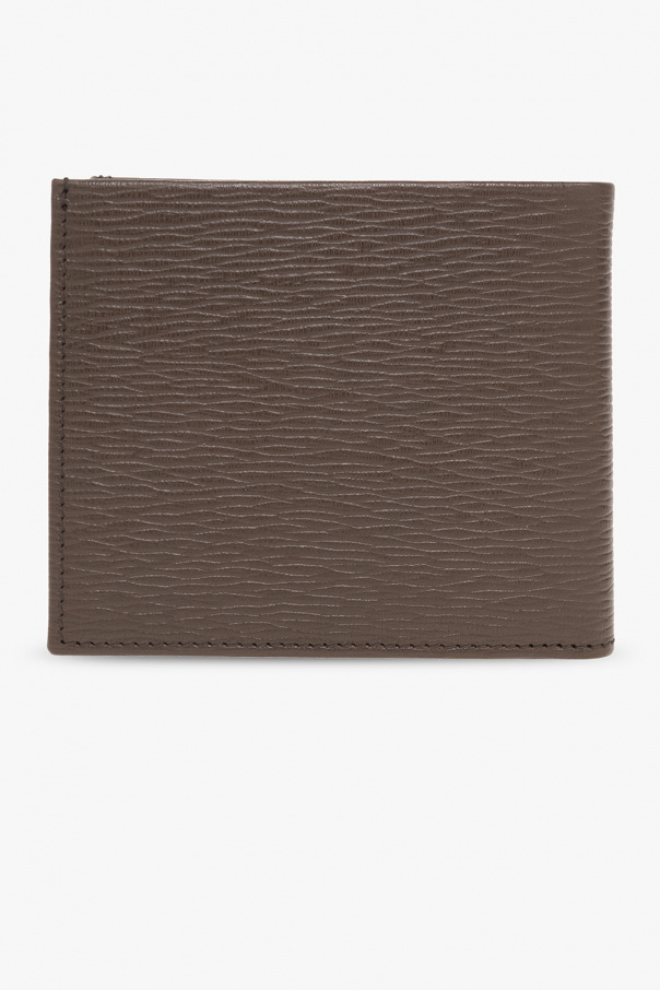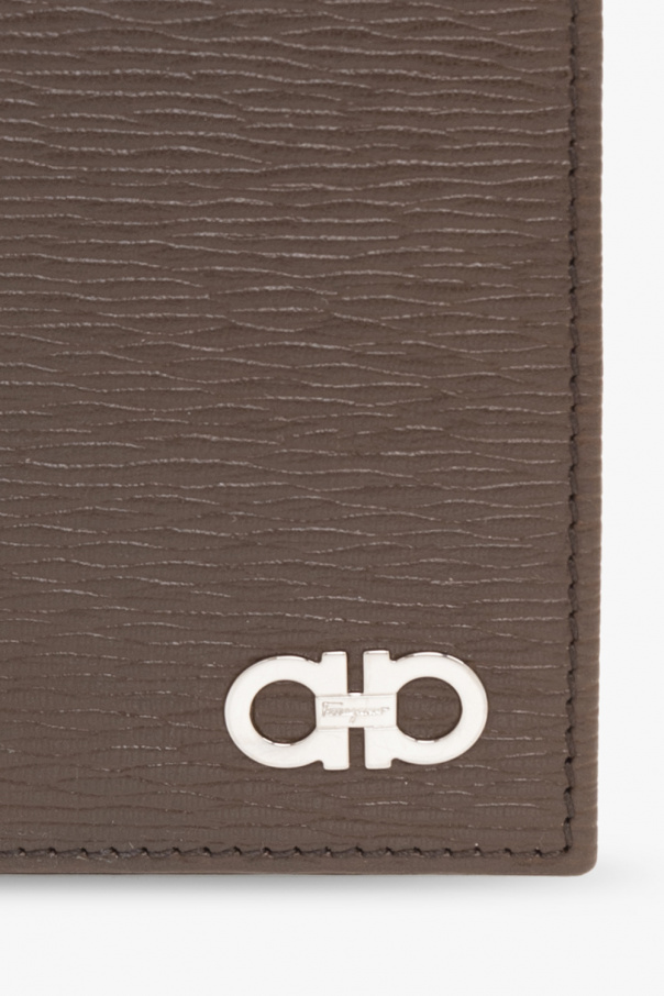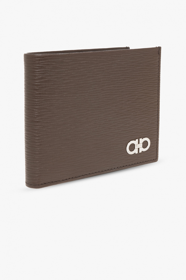 Brown bifold wallet from Salvatore Ferragamo. Made of textured calf leather, this item is decorated with a metal Gancini logo in silver-tone. It has two bill compartments, four slip pockets and eight card slots.
