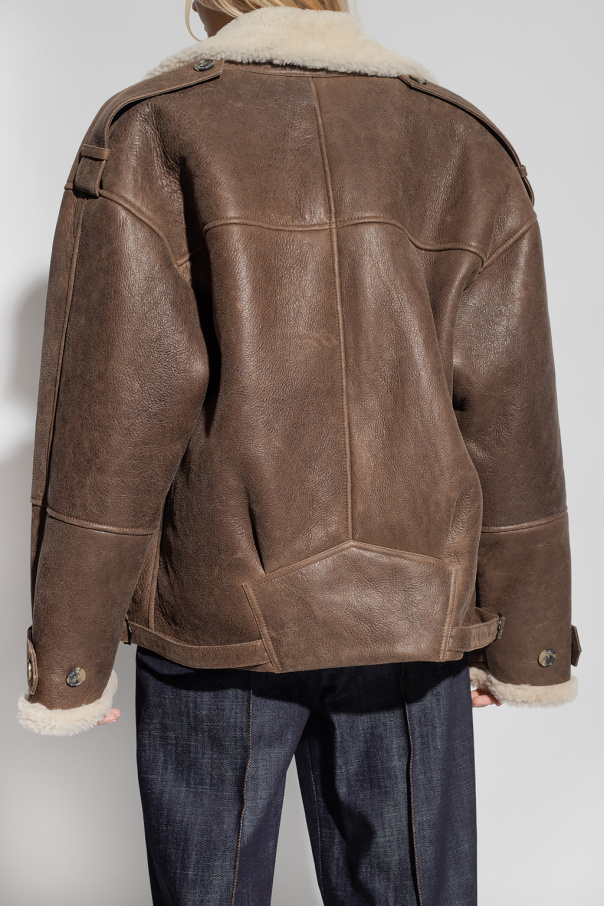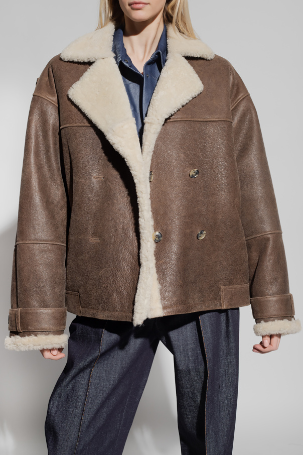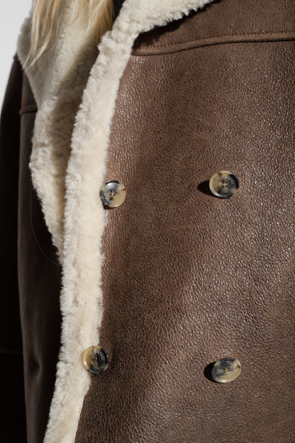 Black ‘Jordan’ shearling jacket from The Mannei. Crafted from sheep leather, this style features a double-breasted, relaxed silhouette with button fastening, shoulder epaulettes, cream fur trims, long sleeves and two flapped pockets.