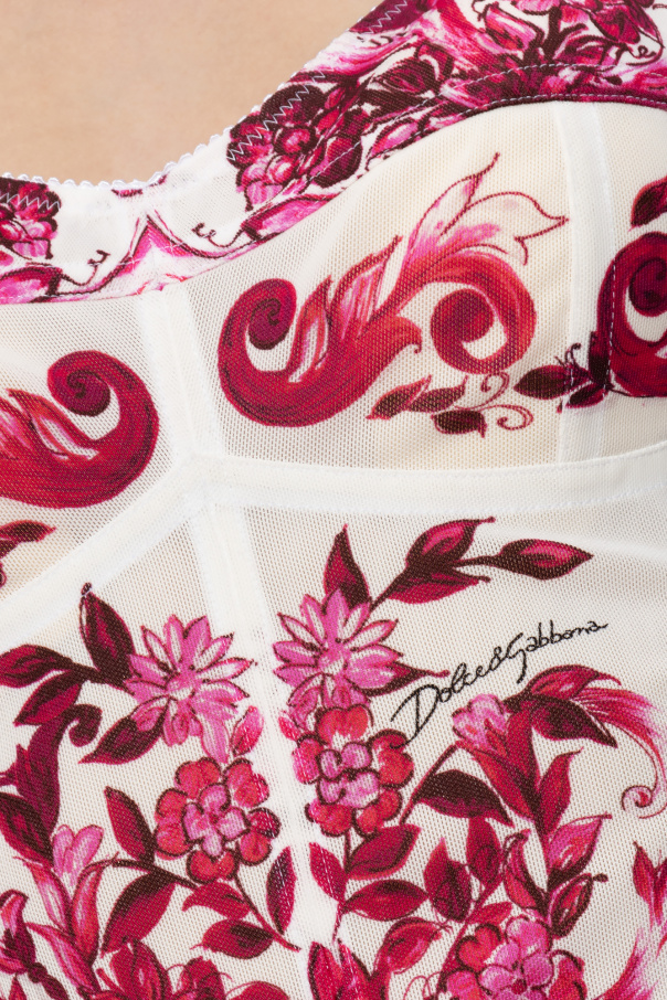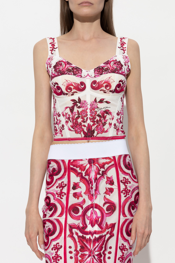 White tank top from Dolce & Gabbana. Cut with a cropped, form-fitting silhouette, this style fastens with a back zipper and showcases a pink ‘Majolica’ print.