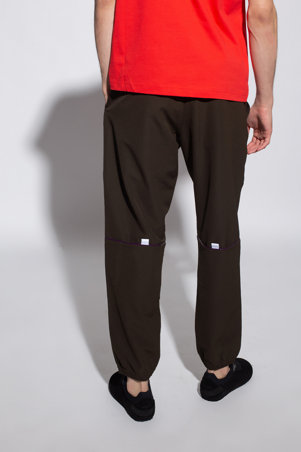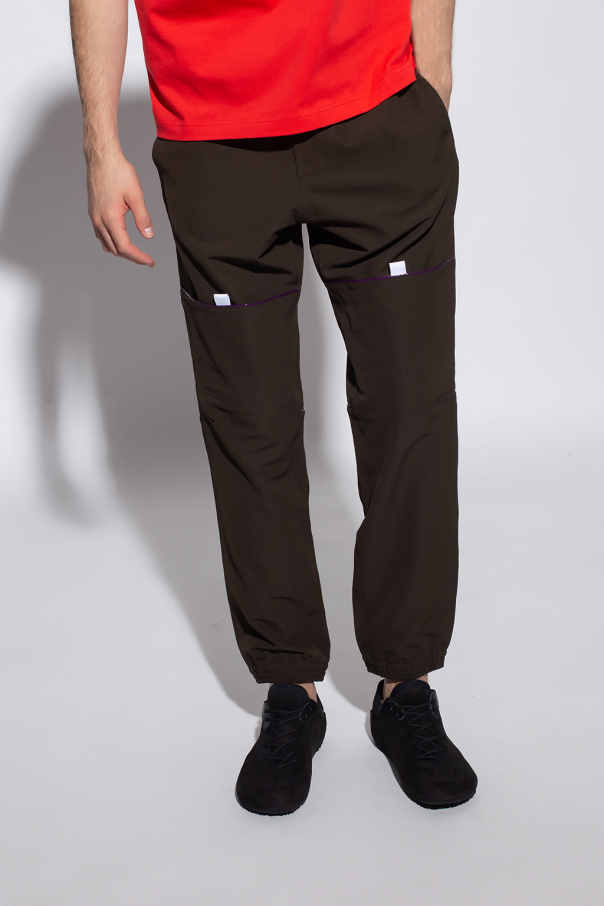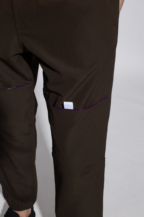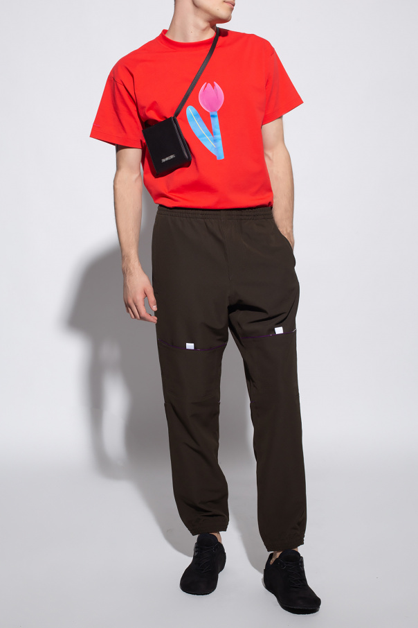Dark green sweatpants from Jacquemus. Fastened with drawstrings, this pair features an elastic waistband, two front pockets, two back pockets, four velcro pockets at the legs, purple and white decorative elements as well as ribbed cuffs.