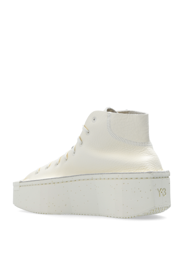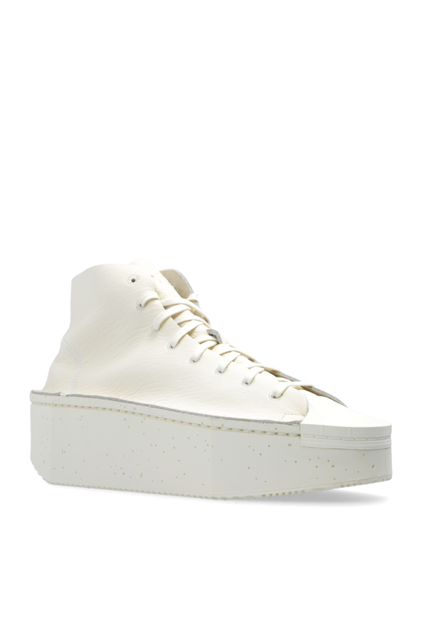 Cream ‘Kyasu Hi’ high-top platform sneakers from Y-3 Yohji Yamamoto. Made from leather, this lace-up model sits on a cream rubber sole accentuated with cutouts and showcases an embossed logo on the back.