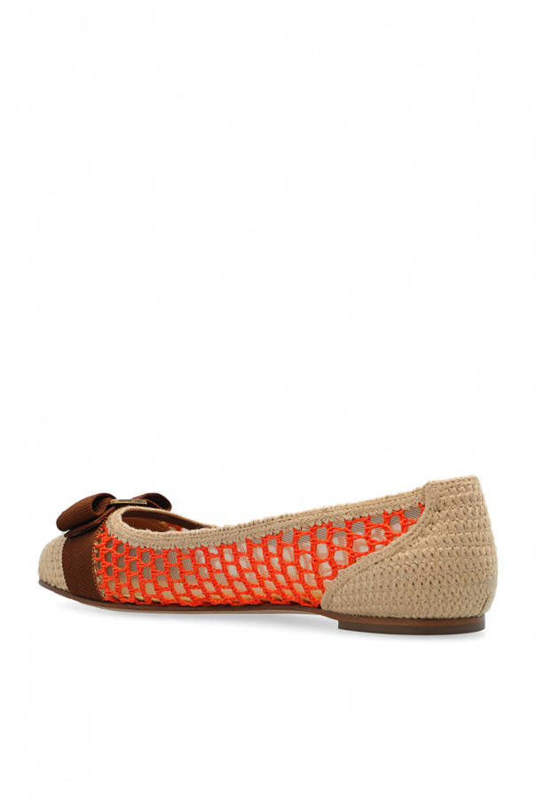 Beige and orange ‘Varina’ ballet flats from Salvatore Ferragamo. Woven from raffia and trimmed with transparent mesh, this model features the brand's signature brown bow with an engraved logo on the front, gold-tone metal details and a beige rubber sole.