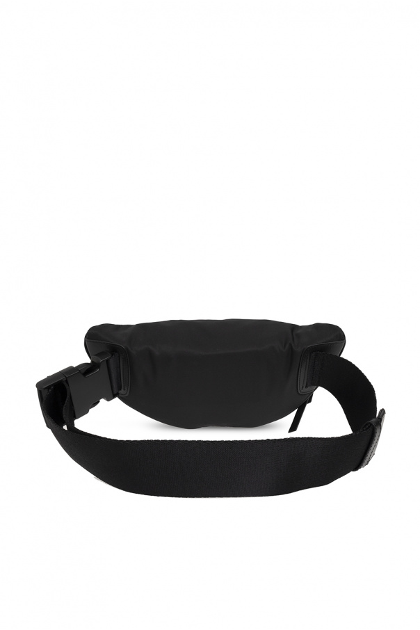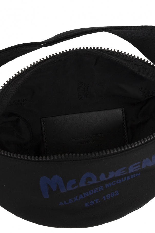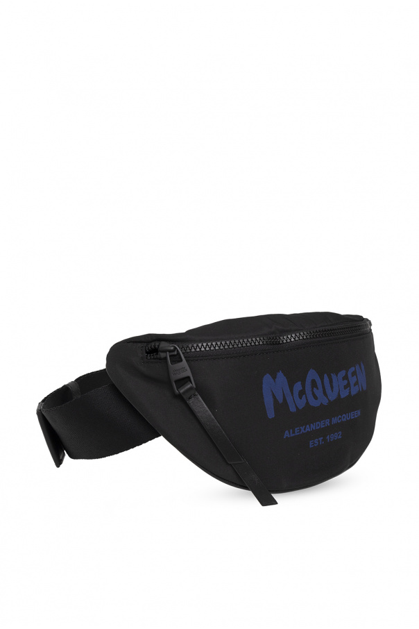 Black belt bag from Alexander McQueen. Fastened with a zip, this item features a dark blue McQueen Graffiti logo print, adjustable shoulder strap and one internal compartment with one card slot.