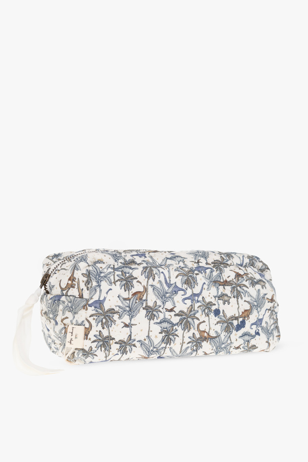 White wash bag from Konges Slojd. Crafted from organic cotton, this design fastens with a zipper and showcases a colourful pattern with flowers and dinosaurs, a logo patch on the front and one internal compartment.