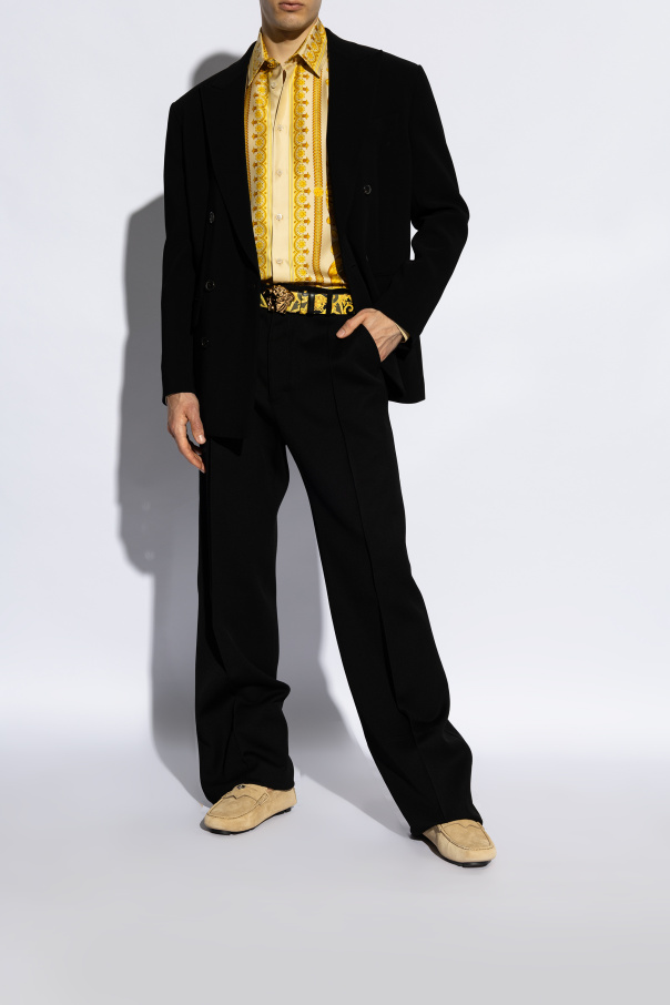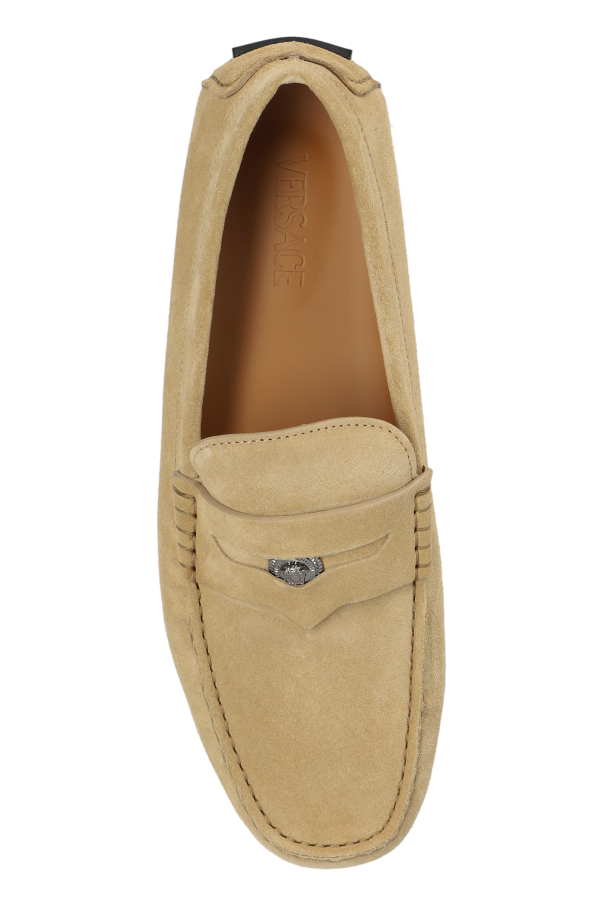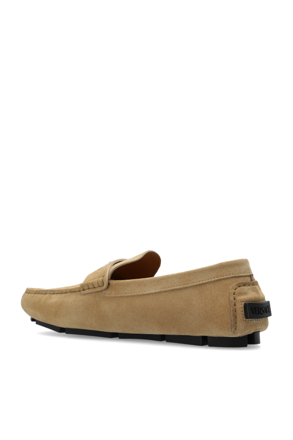 Introducing a quintessential addition to the discerning gentleman's wardrobe: the Versace Beige Suede Loafers. Crafted with meticulous attention to detail, these loafers epitomize classical elegance intertwined with modern sophistication. The dominant beige hue, a testament to versatility, effortlessly complements an array of ensembles, making these shoes a staple for both formal and casual occasions. The exterior, fashioned from the finest suede leather, showcases a textured allure and a matte finish, distinguishing these loafers as a symbol of luxury. The iconic moccasin design, characterized by a decorative seam and a strap across the vamp, is further accentuated by a discreet designer logo on the side, signifying the renowned craftsmanship of Versace. A subtle metallic emblem atop adds an exclusive touch, enhancing the shoe's distinguished appeal. Not only does the outer elegance captivate, but the interior also assures comfort with its leather lining, promising a seamless blend of style and functionality. The rubber sole ensures durability and grip, making these loafers as practical as they are stylish. Why Purchase These Loafers? Timeless design by Versace, perfect for elevating any outfit. Premium suede leather construction for enduring beauty. Versatile beige color that complements a diverse wardrobe. Exquisite details, including a unique metallic emblem, embodying exclusivity. Durable and comfortable, suitable for all-day wear.