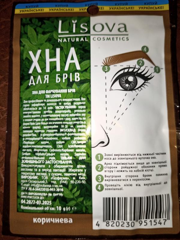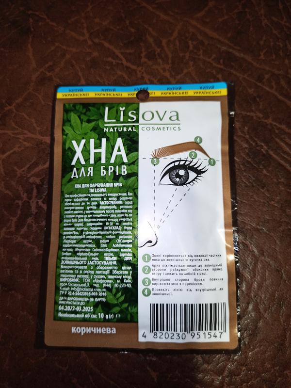 Хна для бровей Lisova обеспечивает окрашивание волосков в насыщенный коричневый цвет и подчеркивает их линию, позволяет визуально скорректировать форму.