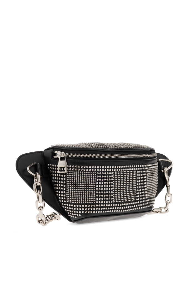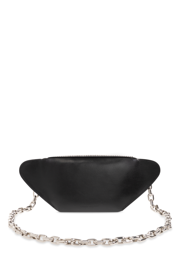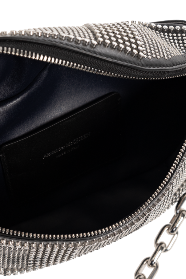 Black ‘Biker’ belt bag from Alexander McQueen. Made of calf leather and decorated with studs, this design fastens via a zip and showcases a printed logo. It is complete with a long chain strap with a lobster clasp, silver-tone metal hardware and one internal compartment.