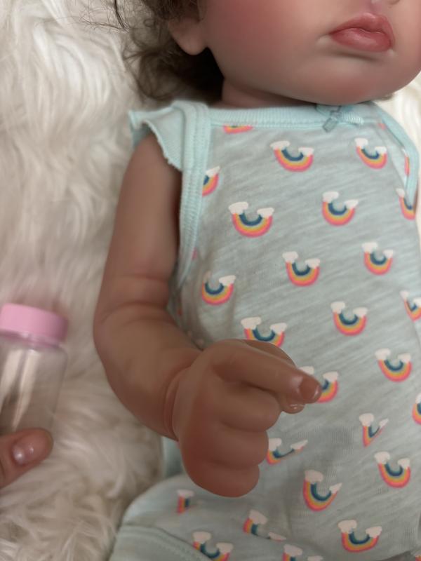 У данной куклы акриловые глаза.Также реборны могут шевелить ножками и ручками, а голова поворачиваться из стороны в сторону. С куклой можно играть в "Дочки матери", катать ее в коляске, укладывать