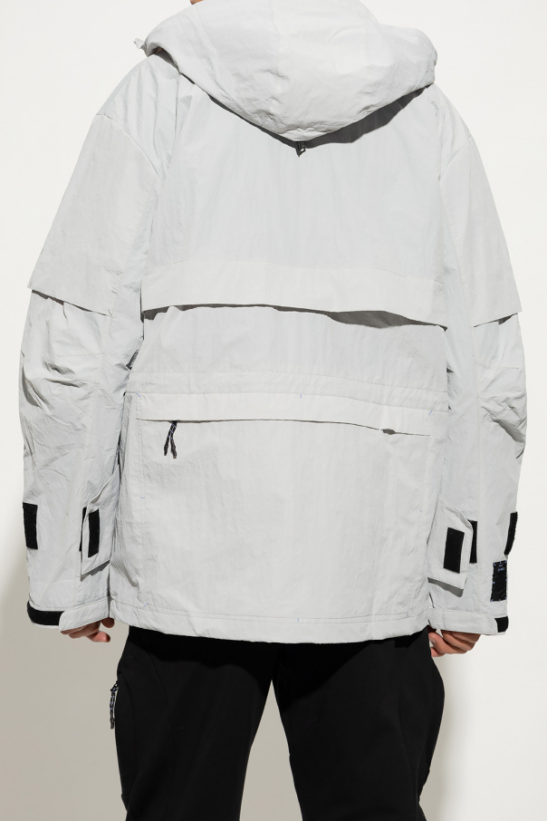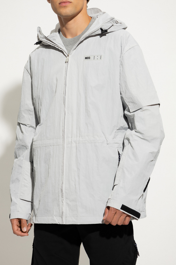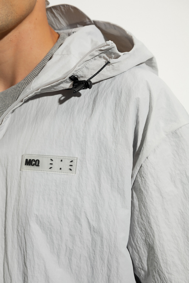 Grey ‘Flash’ jacket with a hood from MCQ, the ‘No. 0’ collection. Emblazoned at front with a translucent rubber logo patch, this style features a zip fastening, a waist-cinching drawstring channel at the waist and hem, black mesh inserts and velcro panels on the shoulders and back, three zip pockets (two on the front, one at the back), and long sleeves with velcro adjusters.