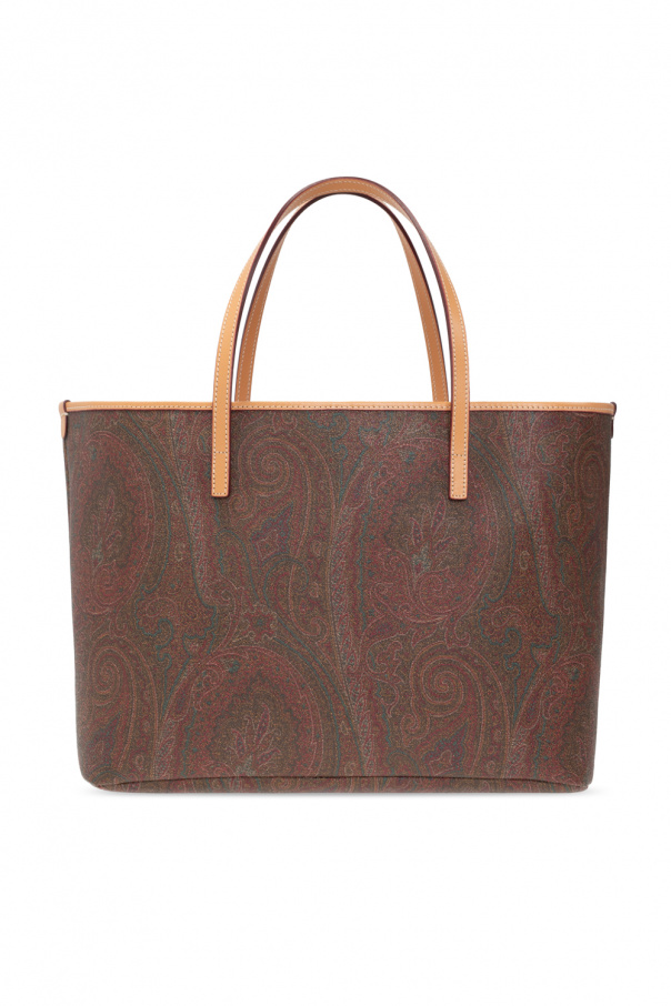 Brown and beige shopper bag from Etro. Crafted from canvas printed with the brand’s signature paisley motif, this style is complete with leather trims, a clip closure, two half-round straps, gold-tone metal hardware and one internal compartment with one zip pocket and a detachable zipped pouch.
