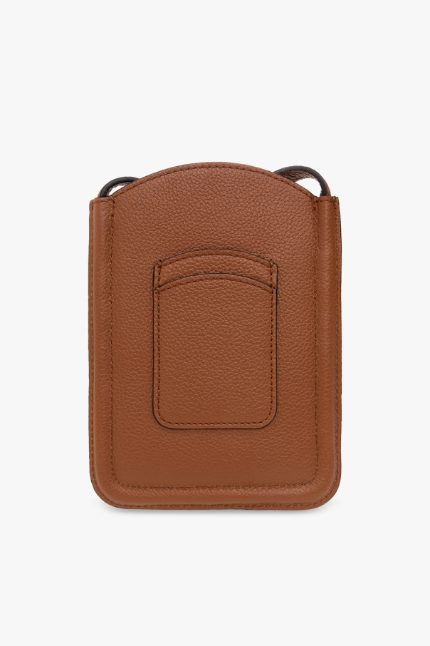 Brown ‘Marcie’ phone pouch from Chloé. Made of leather, this item features decorative stitching, embossed logo, two card slots at the back, adjustable strap and gold-tone metal hardware.
