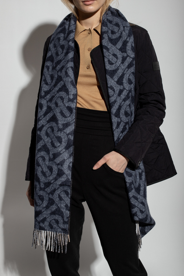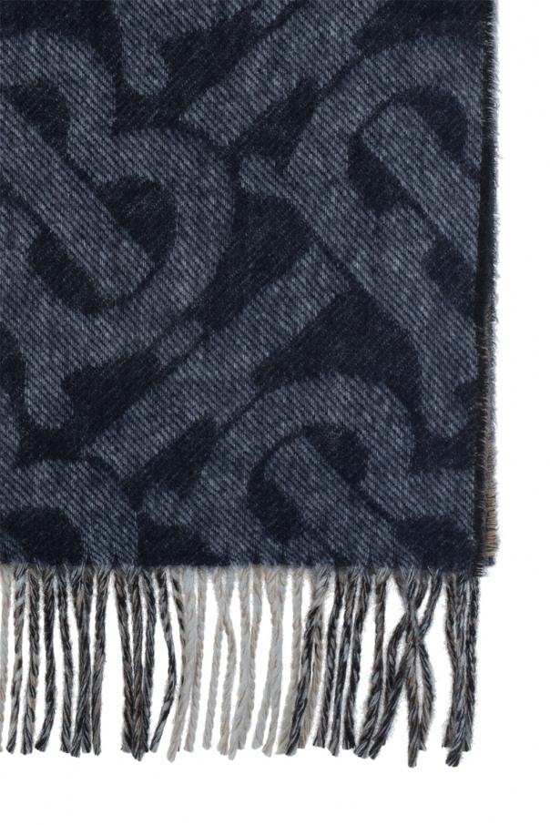 Reversible scarf from Burberry. Made of cashmere, this item is enriched by fringes. One side is navy and white with a logo pattern, the other side is decorated with a check pattern in black, white and beige.