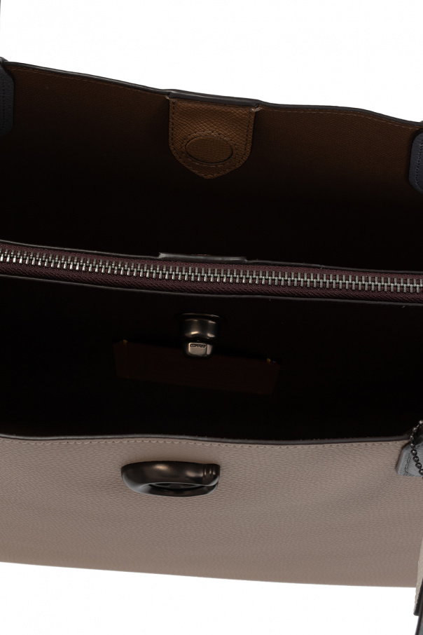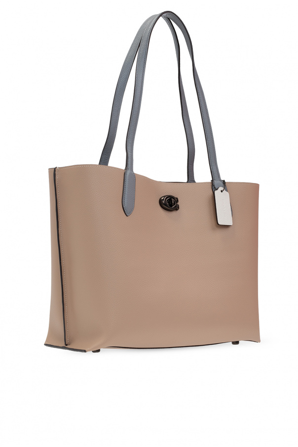 Beige and grey 'Willow' shopper bag from Coach. Made of grainy leather, this design secures with a decorative logo fastener and a magnetic closure and features white stitching details, two half-round handles and a purple and brown-clad interior with two compartments and one zip pocket.