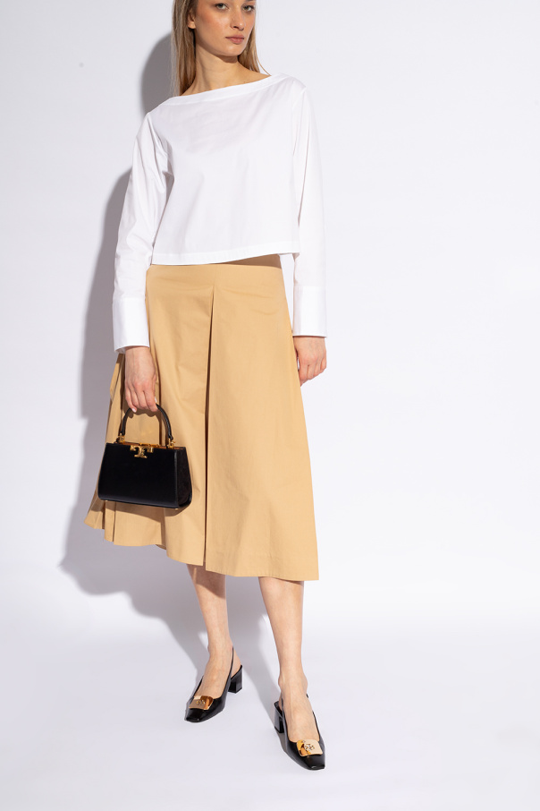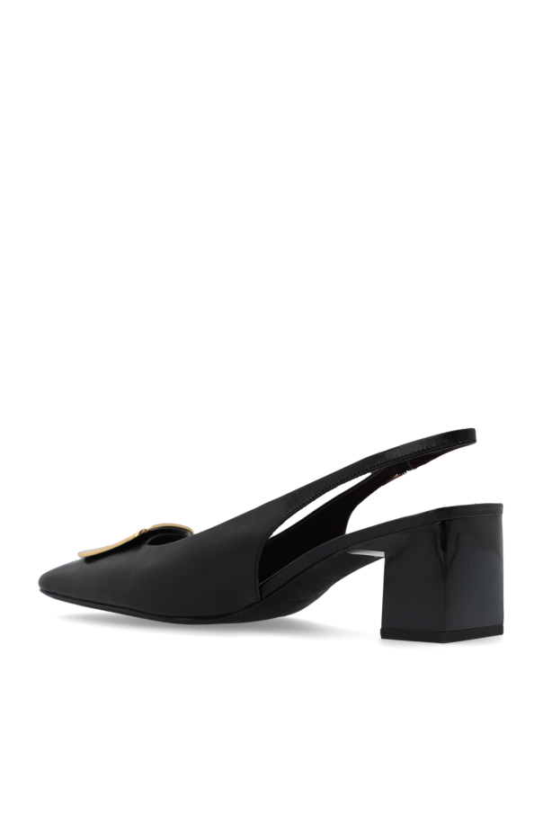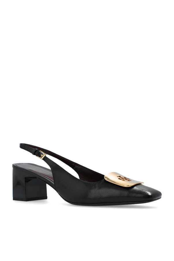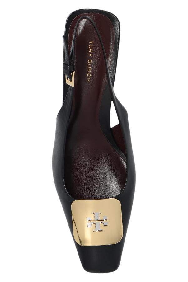 Black ‘Georgia’ pumps from Tory Burch. Made of leather, this model sits on a black leather sole and features an adjustable buckle strap on the back, a wide heel and a tapered, square toe accentuated with gold-tone and silver-tone logo hardware.