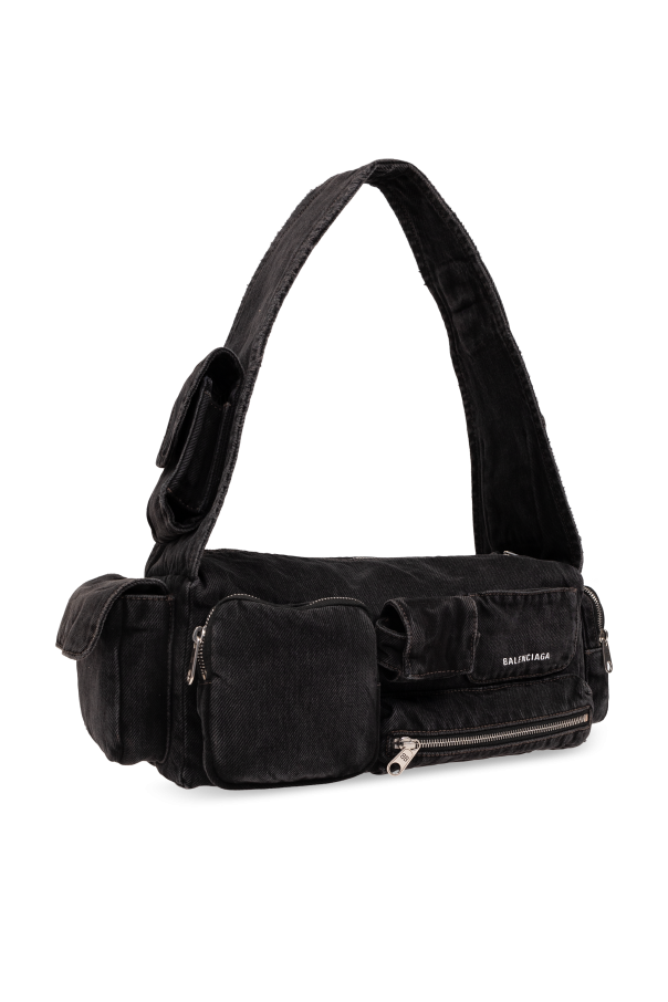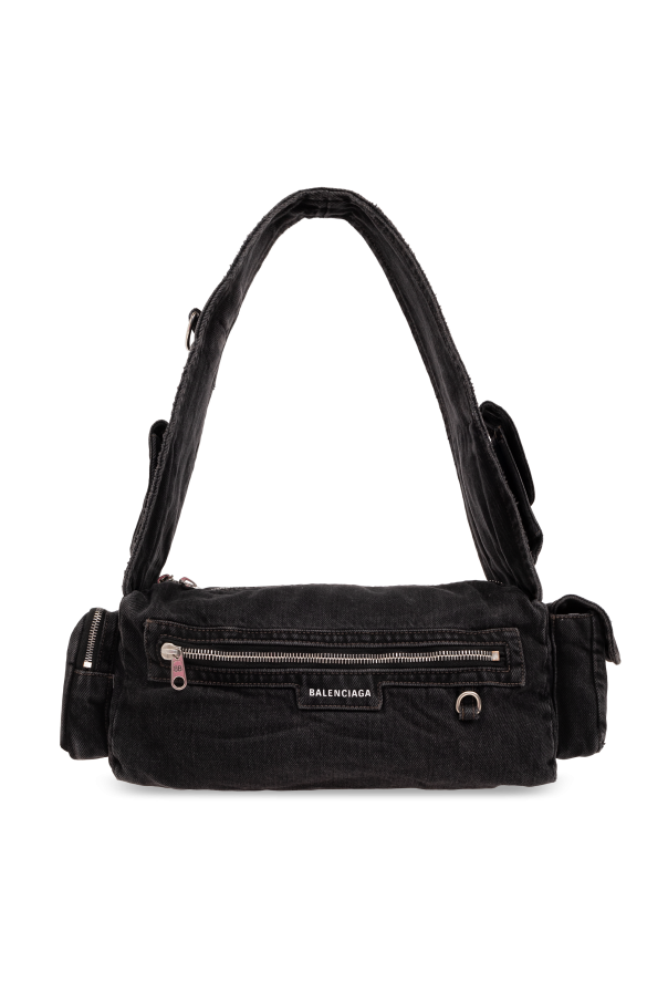 Introducing the 'Superbusy Small' shoulder bag by Balenciaga, a masterpiece of design that elegantly combines functionality with a touch of luxury. Crafted from a material that mimics the softness and plush texture of suede or velvet, this bag is a testament to sophisticated style and refined taste. The rectangular silhouette, accentuated by crisp, horizontal lines, exudes modernity while maintaining the iconic elements of the Balenciaga brand. The bag features an adjustable shoulder strap and is adorned with several external pockets, each secured with a sleek, silver-toned zipper that contrasts strikingly against the bag's black fabric. Notably, the front pocket boasts the designer's logo, serving as a hallmark of authenticity and luxury. Furthermore, the 'Superbusy Small' is enhanced with additional handles, offering versatile carrying options to suit any occasion. Inside, the bag reveals a spacious interior with compartments designed for optimal organization, making it as practical as it is stylish. The dual-zip closure ensures your belongings are secure, while the numerous pockets allow for easy access to essentials. Why Purchase This Product? Exemplary craftsmanship from Balenciaga, a renowned fashion house. Luxurious material that offers both aesthetic appeal and durability. Functional design with multiple pockets and compartments for organization. Versatile carrying options for enhanced usability. Striking visual contrast with silver-toned hardware against a sleek black backdrop.