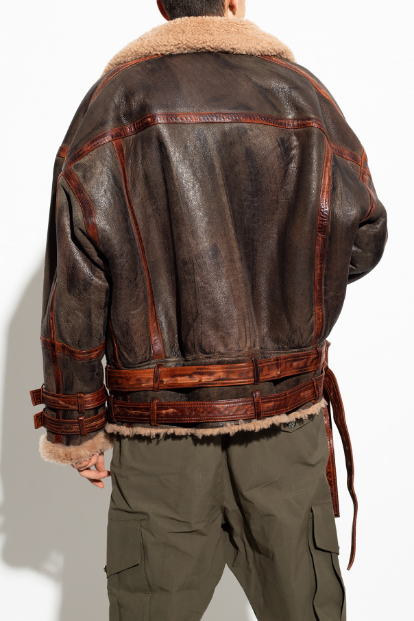 Brown shearling coat from Balmain. Crafted from lamb leather and fur, this style fastens via a two-way zipper and features a colourful logo patch on the front, two slip pockets, one zipped pocket and buckle straps placed on the collar, bottom hem and cuffs.