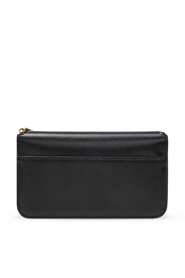 Black phone holder from Saint Laurent. Crafted from calf leather, this accessory fastens via snap-button and employs gold-tone YSL initials in metal, an external slip pocket on the back, chain shoulder strap and one internal compartment.