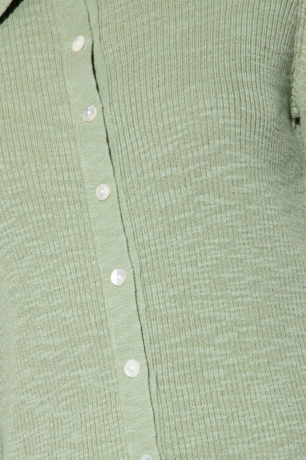 Green knit shirt from Theory. Crafted partially from cotton, this design features button fastenings, decorative cut-outs on the sides and long sleeves with buttoned cuffs.