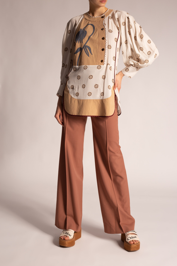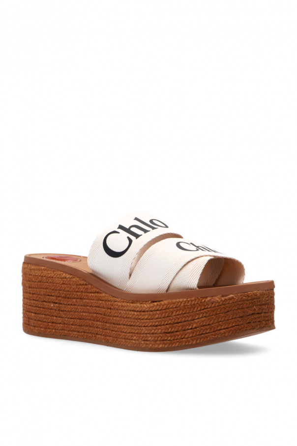 Brown and beige wedge slides from Chloé. Resting on a brown rubber sole, this design features a printed logo pattern in black.