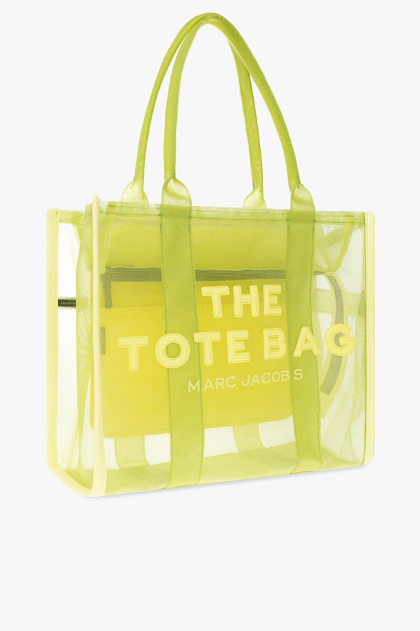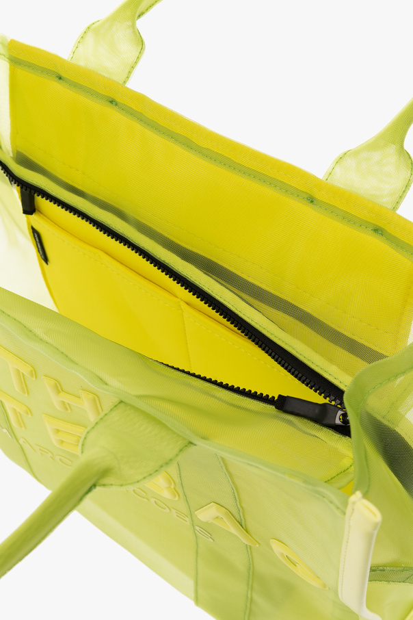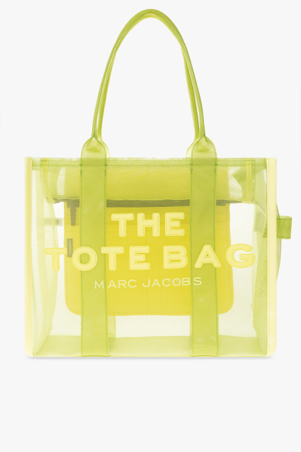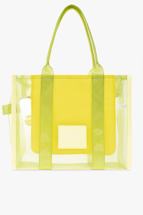 Light green ‘The Mesh Tote Large’ shopper bag from Marc Jacobs. Crafted from transparent fabric and trimmed with faux leather, this design showcases a raised logo on the front and a patch at the back. It is complete with two half-round handles and one internal compartment with one zip pocket and two slip pockets.