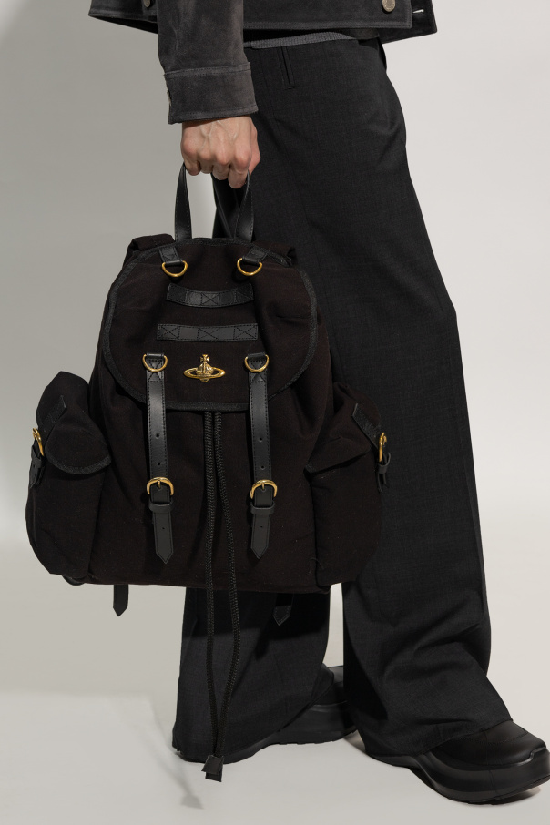 Black backpack from Vivienne Westwood. Made of recycled materials, this design features a buckle strap fastening, logo detail, two slip pockets, half-round handle, adjustable shoulder strap, gold-tone metal hardware and one internal compartment with drawstrings and one zip pocket. Handmade in Kenya.