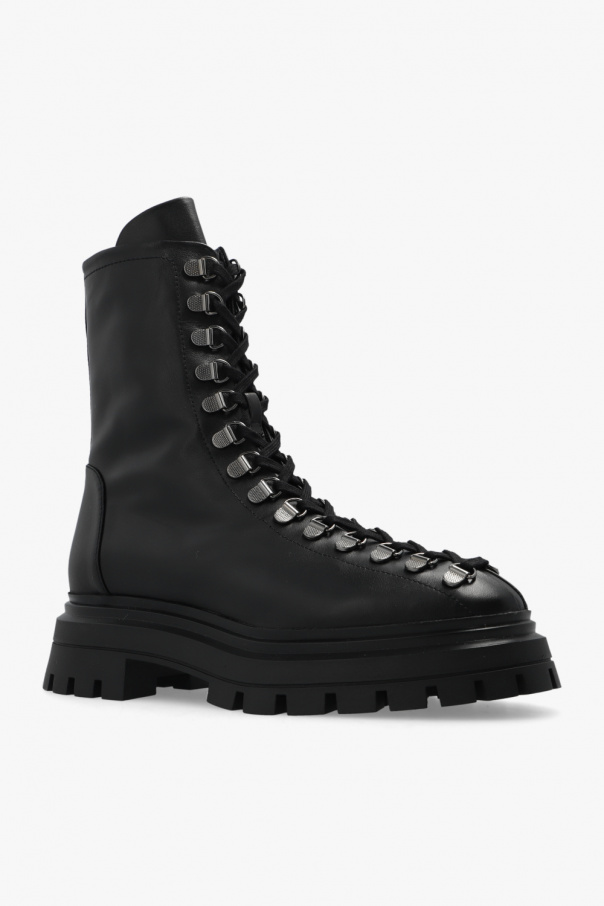 Black ‘Bedford’ ankle boots from Stuart Weitzman. Crafted from calf leather, this model sits on a black rubber sole and features distinctive lace-up fastenings, a side zipper and an embossed logo at the back.