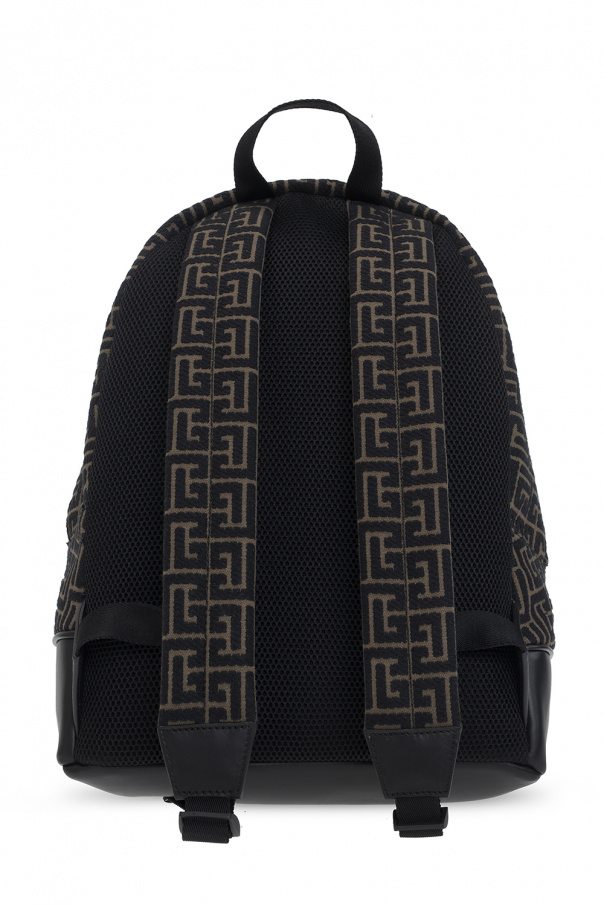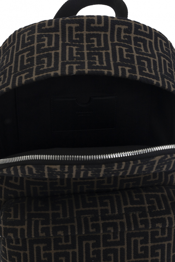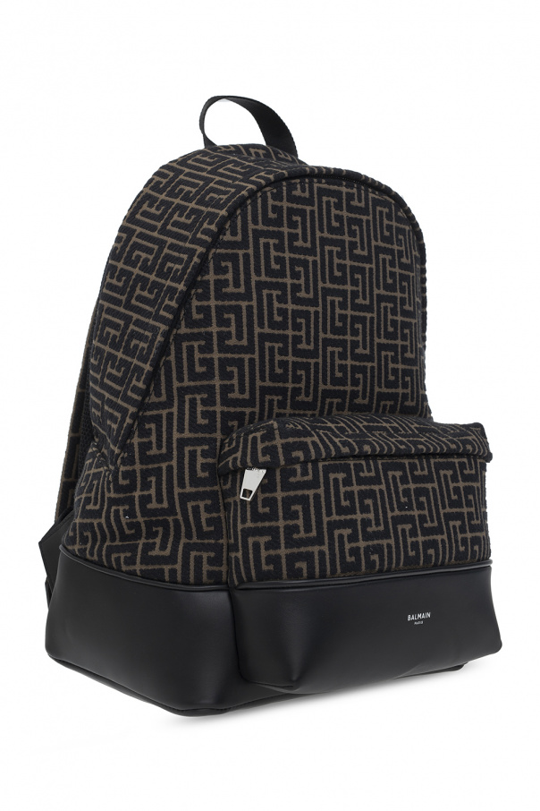Brown and black '1945' backpack from Balmain. Crafted from a fabric embellished with a jacquard monogram pattern and trimmed with leather, this design features a two-way zip fastening, a zipped pocket printed with a silver-tone logo on the front, adjustable shoulder straps, silver-tone metal hardware and one internal compartment with one card slot and one slip pocket.