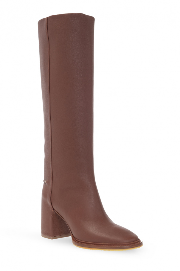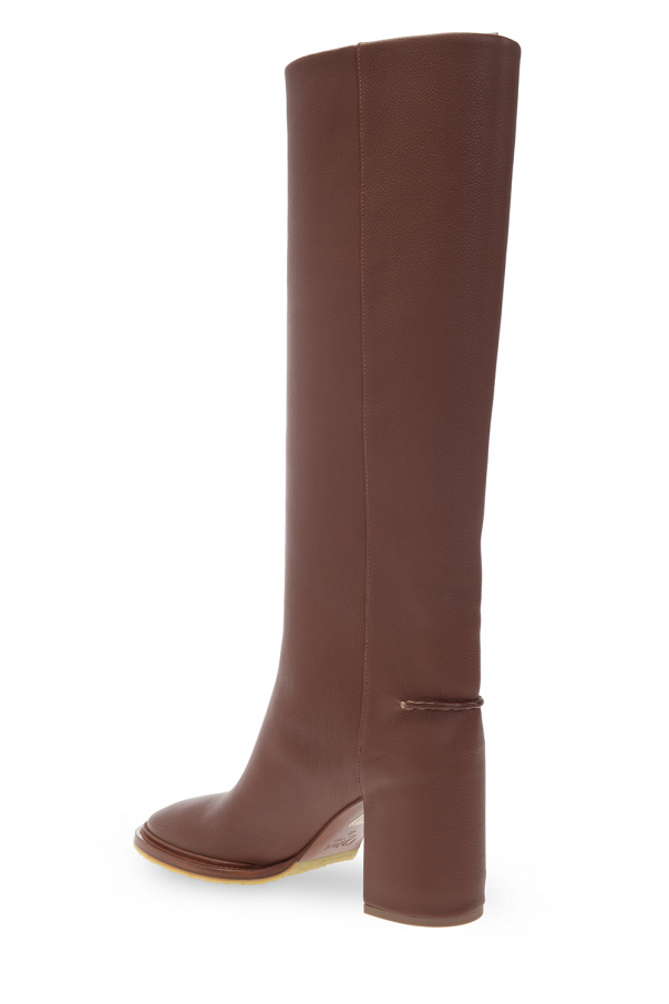 Brown ‘Edith High’ knee-high boots from Chloé. Made of calf leather, this model features distinctive stitching on the back and a brown and yellow rubber sole trimmed with bovine leather.