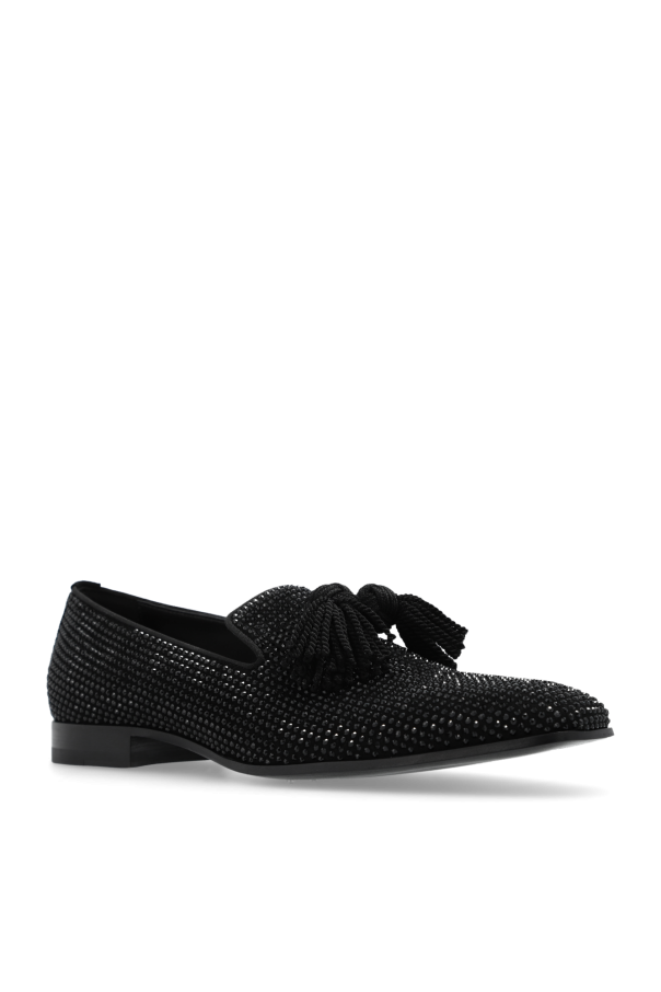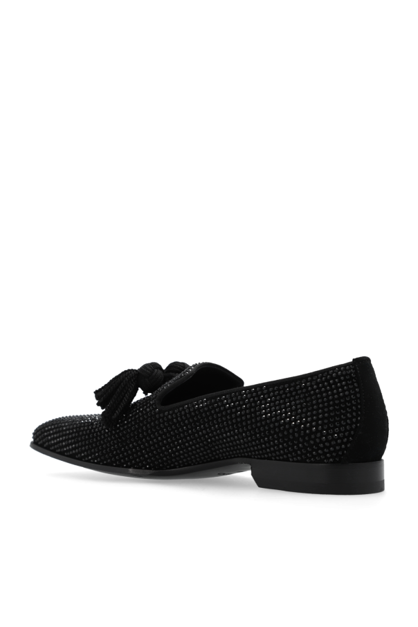 Black ‘Foxley’ loafers from Jimmy Choo. Made of suede embellished with crystals, this pair features decorative tassels and a black leather sole.