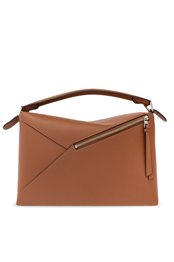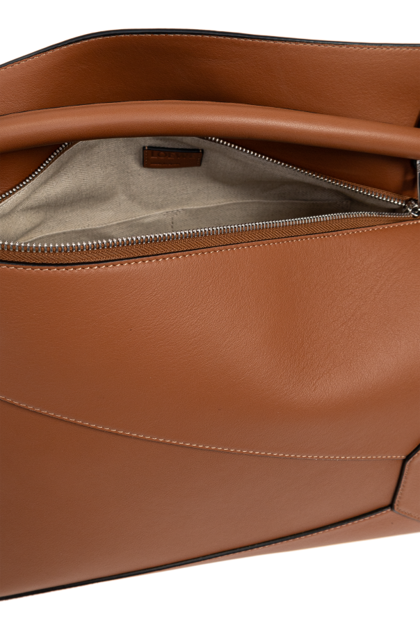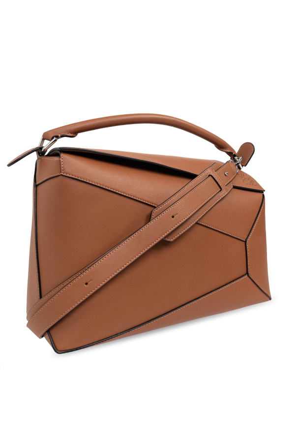 Introducing the ‘Puzzle Edge Large’ shoulder bag by Loewe, a testament to avant-garde design and impeccable craftsmanship. This piece stands out with its unique, irregular puzzle-like shape adorned with geometric lines and folds, presenting a modern and original aesthetic. Crafted from high-quality calfskin leather, the bag showcases an even hue and smooth surface, evidence of its refined construction. Precision stitching throughout the piece underscores its meticulous creation. The dominant brown color lends the bag a classic and elegant allure, further enhanced by a zipper that seamlessly blends with the leather’s shade, and a subtly engraved designer logo on the strap, confirming the item's authenticity. The ‘Puzzle Edge Large’ is not only a marvel of design but also functionality. It features an adjustable, detachable strap allowing for versatile wearing styles. Its interior, lined in a lighter material, creates a striking contrast while facilitating the organization and retrieval of items. The bag includes a flat base for stability, a rear zip pocket, and an internal compartment with two slip pockets, blending practicality with style. Why Purchase This Product? Exceptional design uniqueness with its puzzle-inspired shape and geometric elegance. Constructed from premium calfskin leather for durability and a sophisticated look. Enhanced functionality with its stable base, internal compartment, and additional pockets for organized storage. Versatile style options with an adjustable and detachable strap. Authenticity guaranteed with Loewe’s subtle branding.