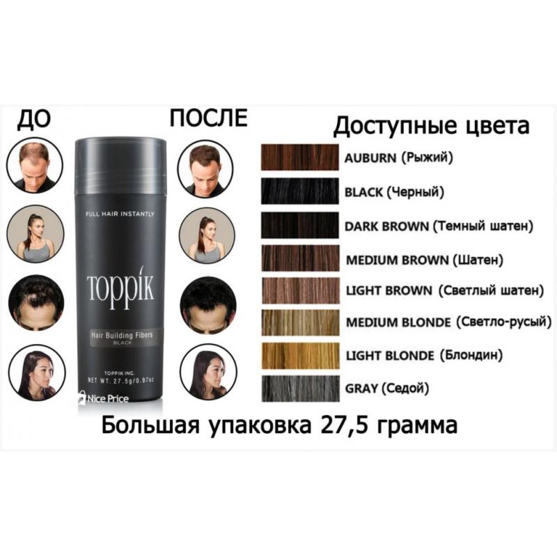 Кератиновый загуститель для волос (пудра) Toppik - это современное косметическое средство, специально разработанное для коррекции проблемных зон (залысин) у людей с редеющими и негустыми волосами. Кератиновые микроволокна являются высокотехнологичным продуктом, который состоит из микроволокон - «волосков» кератина. Кератиновые микроволокна выглядят, как порошок и наносятся непосредственно на зону залысины.