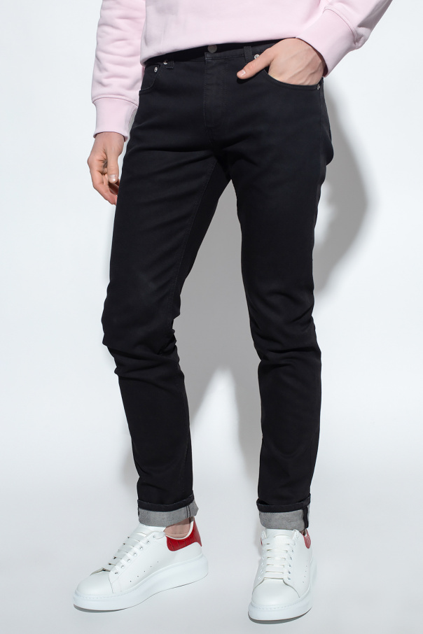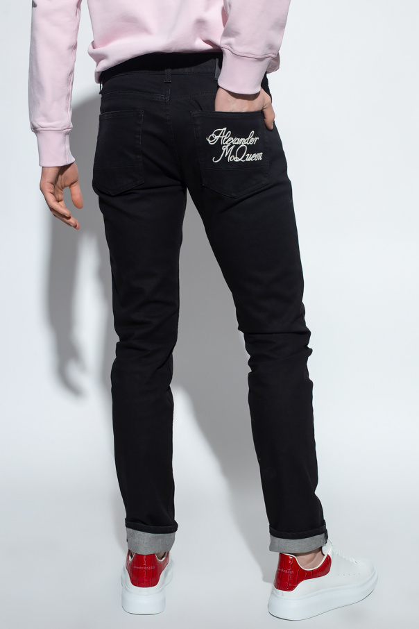 Black jeans from Alexander McQueen. Made of cotton from sustainable farms, this tapered leg pair features a silver-tone zip and button, white logo embroidery at the back and five slip pockets.