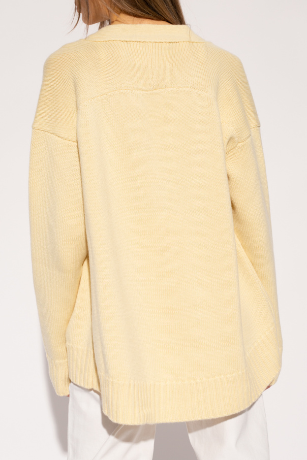 Light yellow cardigan from Jil Sander. Made of cashmere, this style features a V-neckline, button fastenings and long sleeves.