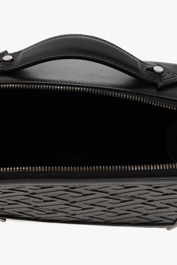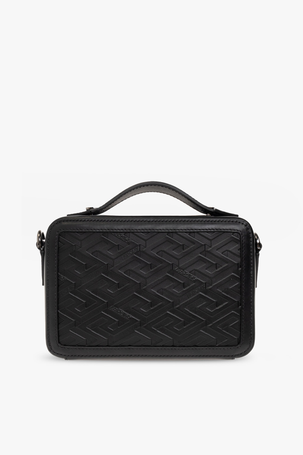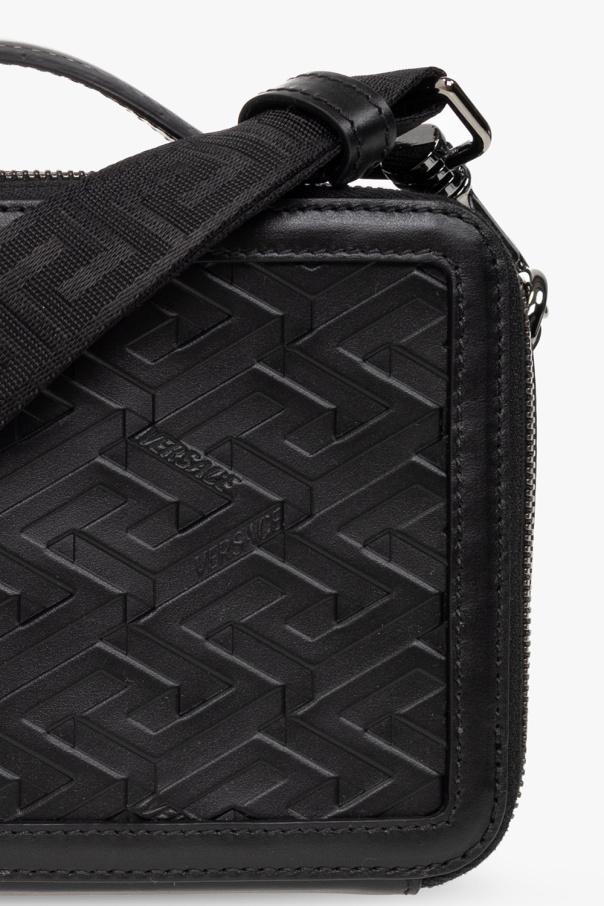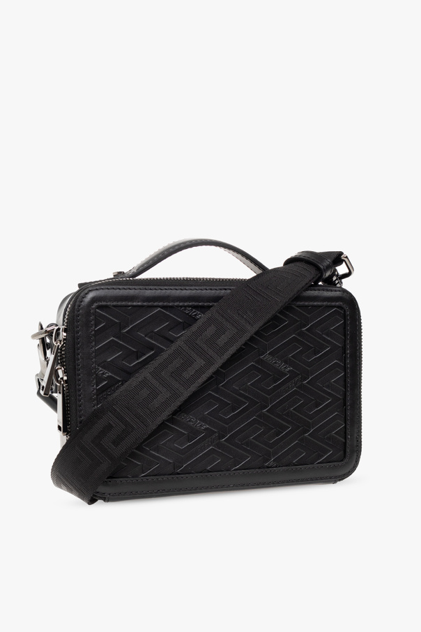 Black shoulder bag from Versace. Made of calf leather, this model fastens with a two-way zip and is decorated with an embossed La Greca motif. It is complete with a top handle, adjustable shoulder strap with an embroidered Greca pattern, silver-tone metal hardware and one internal compartment with one slip pocket and four card slots.