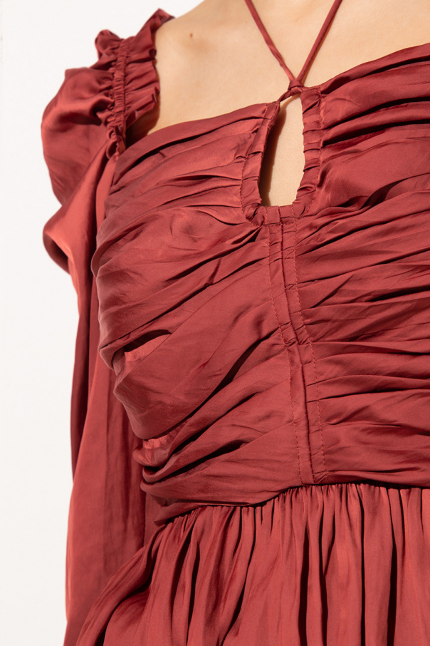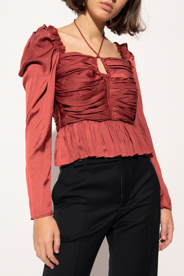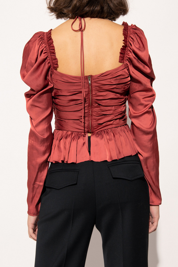 Red ruched top from Ulla Johnson. Fastened with a back zip, this garment features a decorative tie neck, ruffle trims and long puff sleeves.