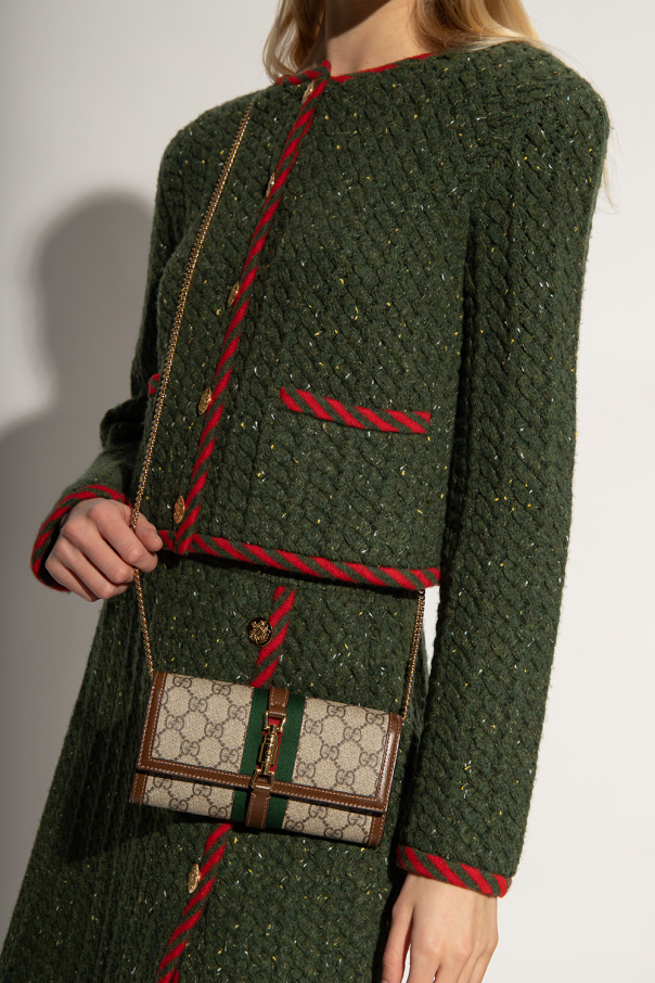 Beige and brown ‘Jackie 1961’ wallet from Gucci. Crafted in ‘GG Supreme’ canvas and leather, this design secures with a distinctive snap and showcases the brand's iconic green and red ‘Web’ stripe, a detachable chain shoulder strap, gold-tone metal hardware and two bill compartments, one zip coin pocket, two slip pockets and twelve card slots inside.